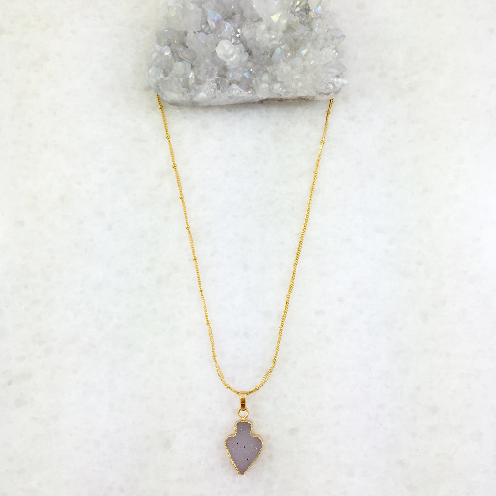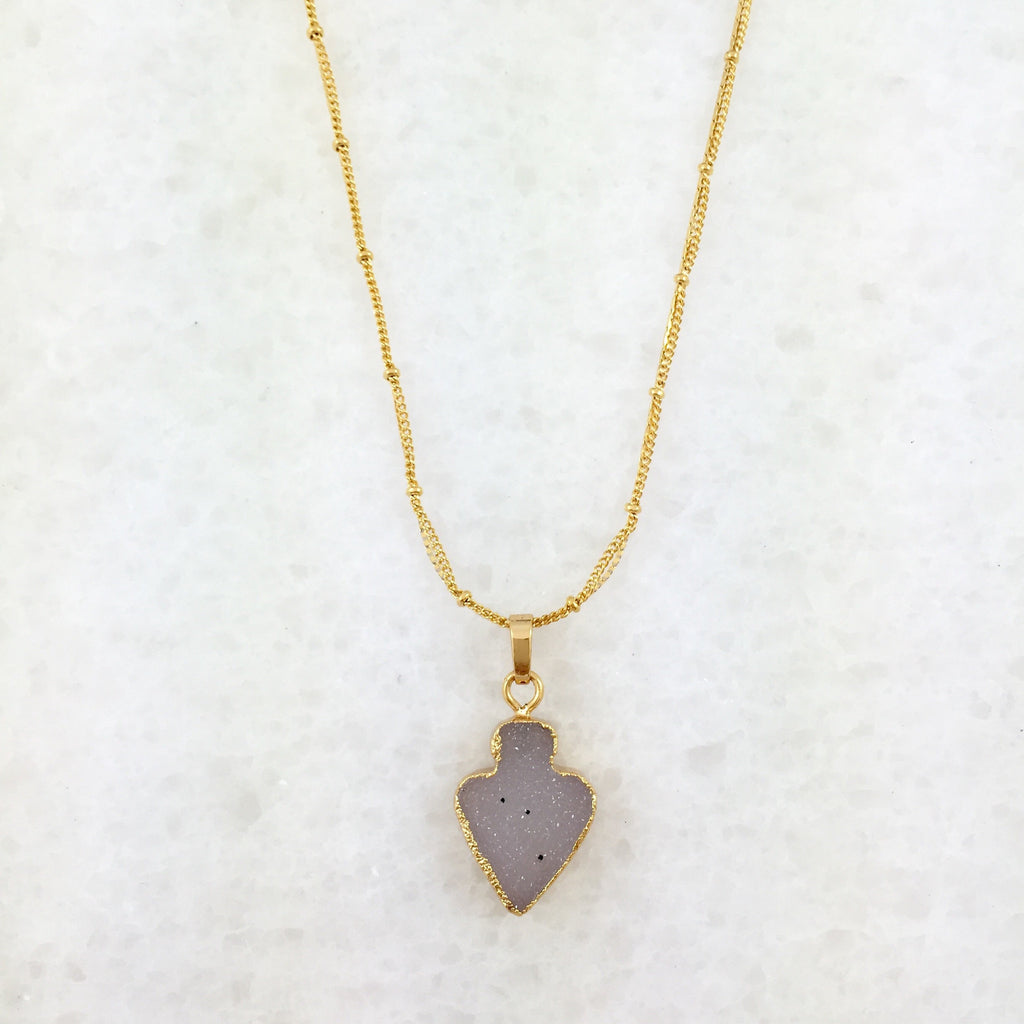 this one of a kind necklace is made from a beautiful natural neutral grey tone druzy stone. It features a spade shape design and is on a unique necklace with double connected ball design gold tone chain. Get this everyday neutral to add to your collection and enjoy the compliments you receive when wearing it.